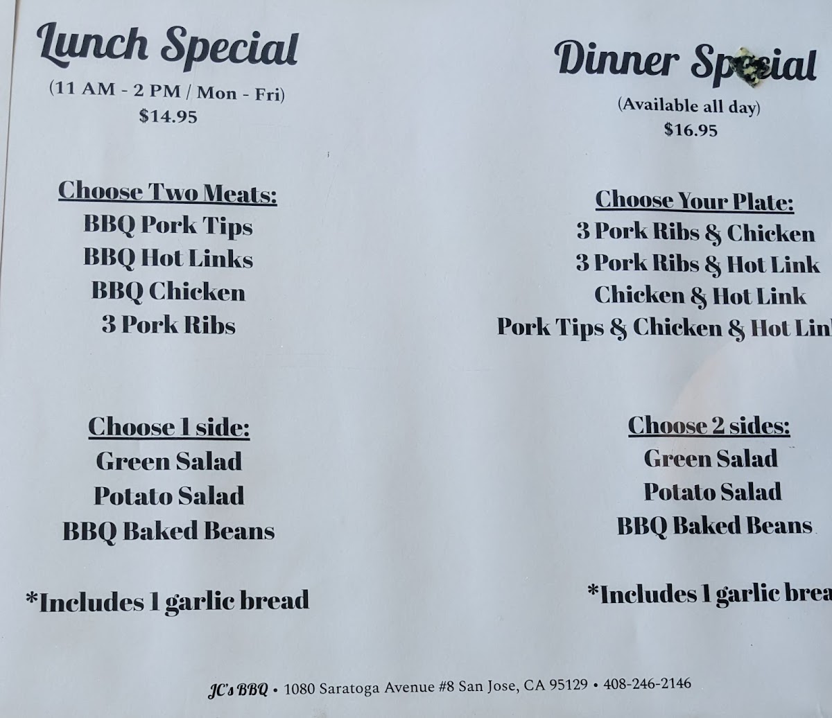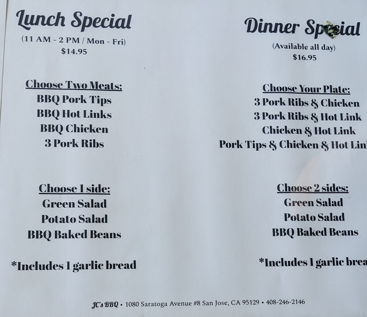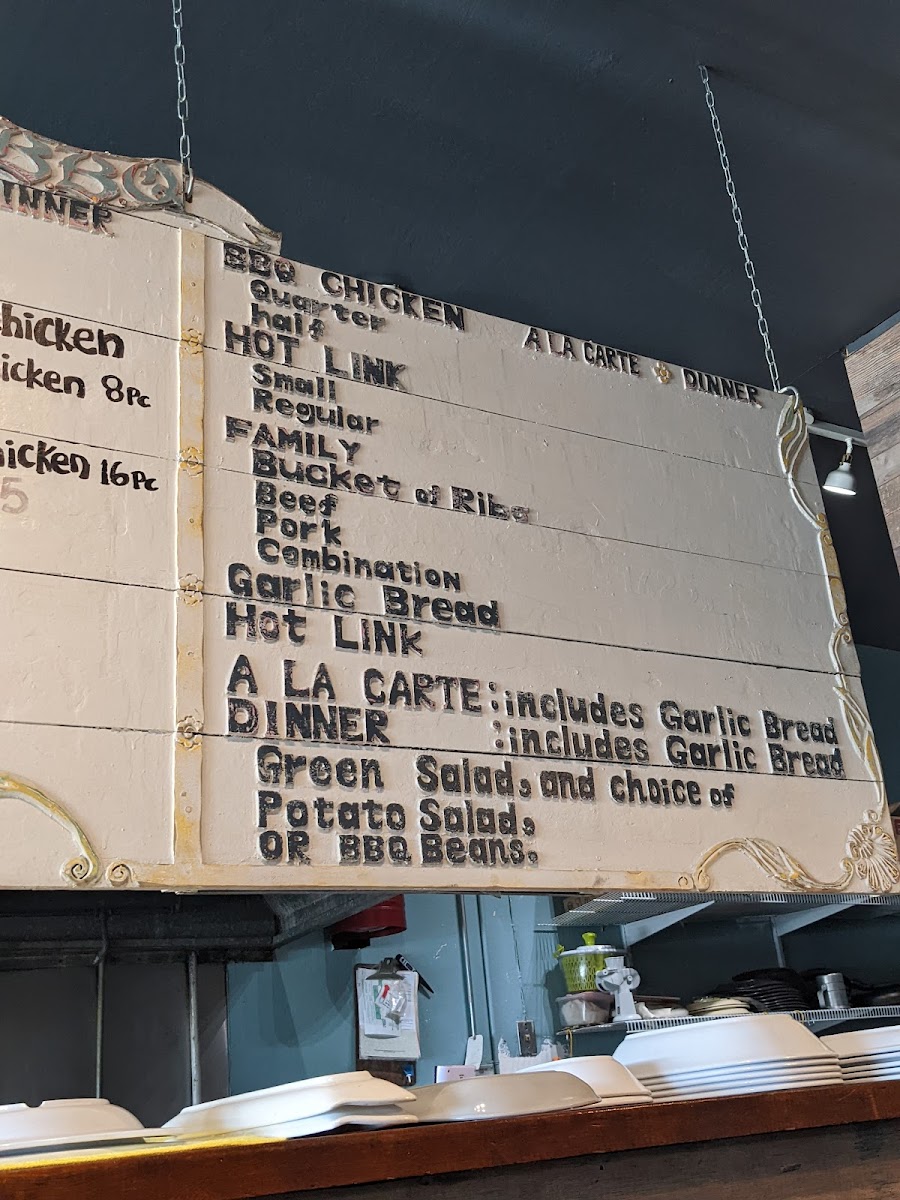 Choose from pork ribs, hot link, BBQ chicken and pork tips. Includes 2 sides and garlic bread.