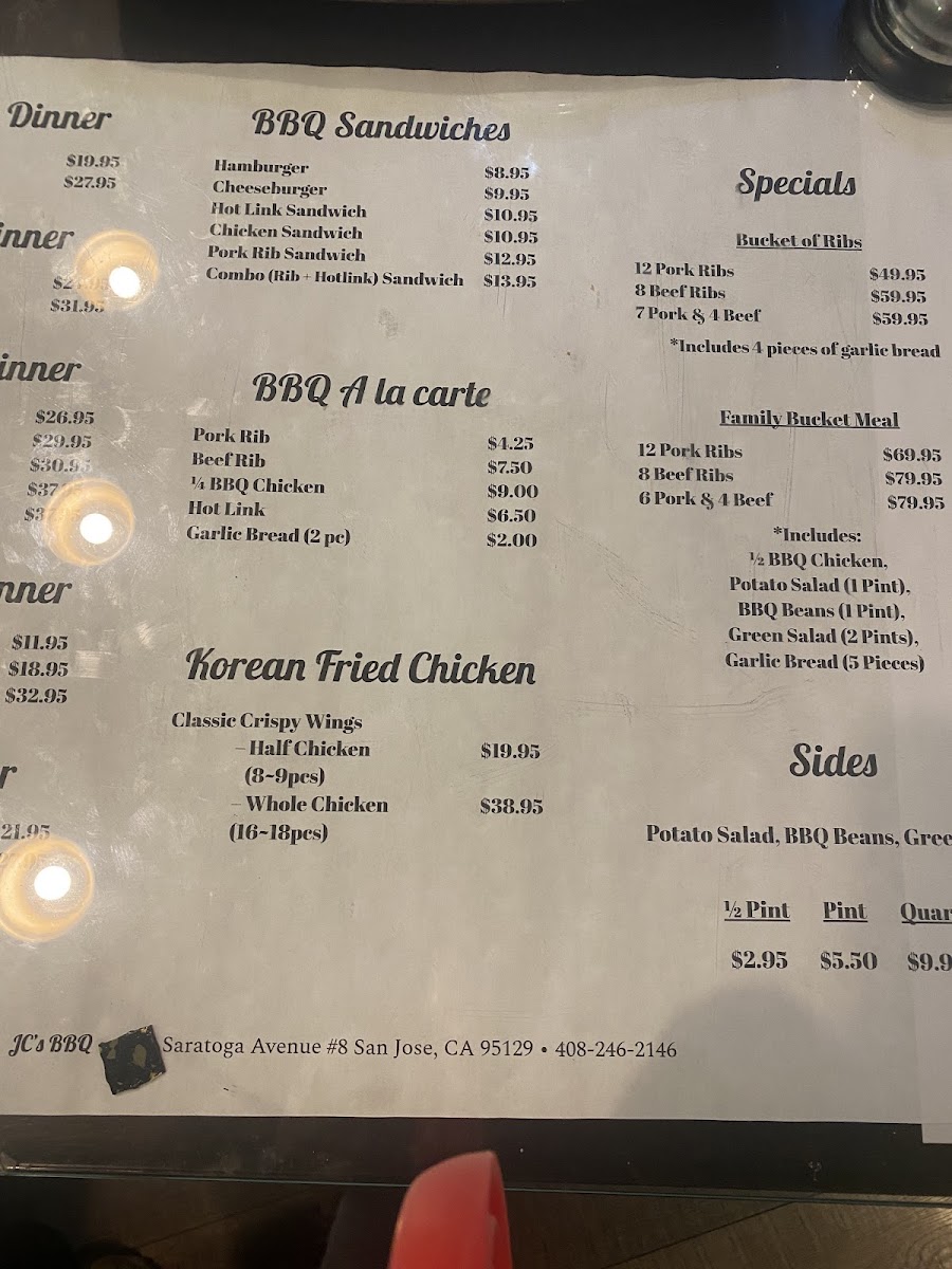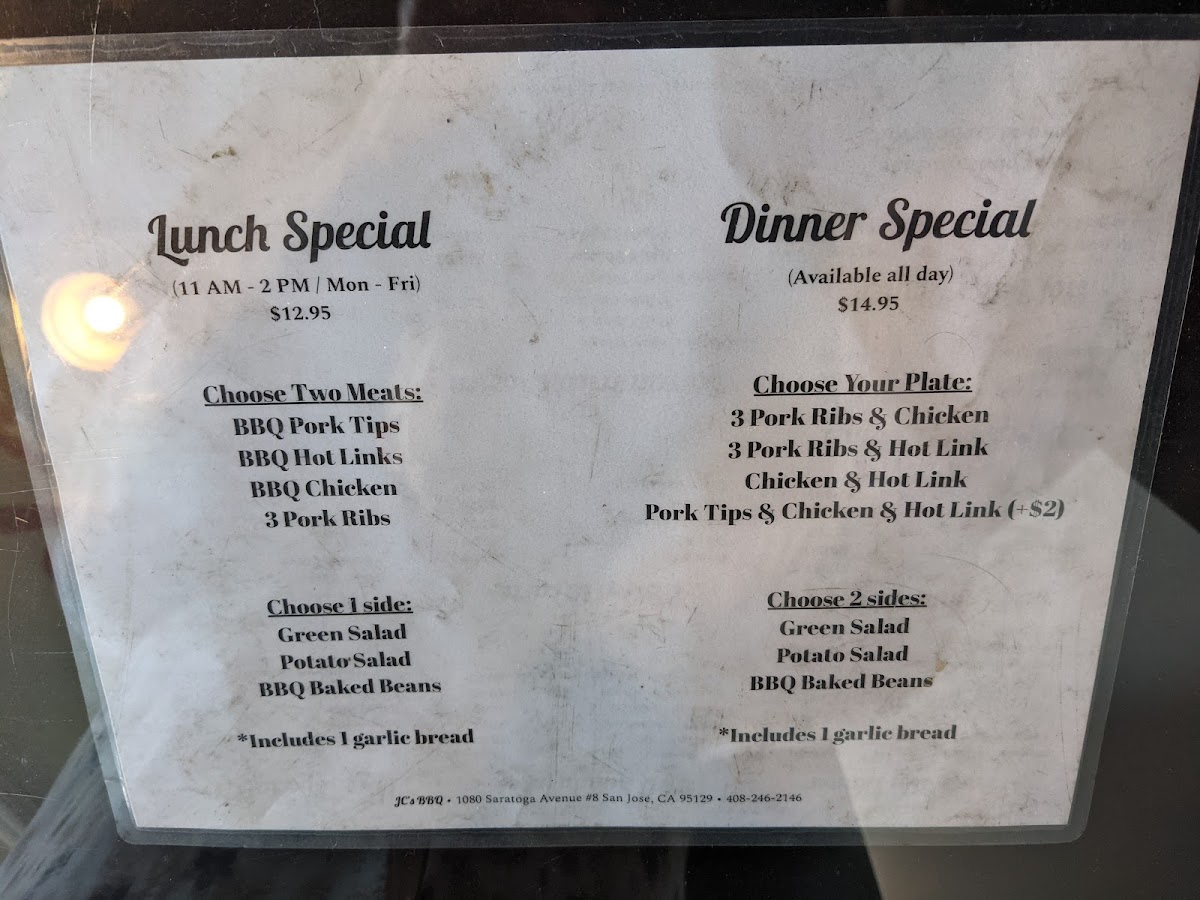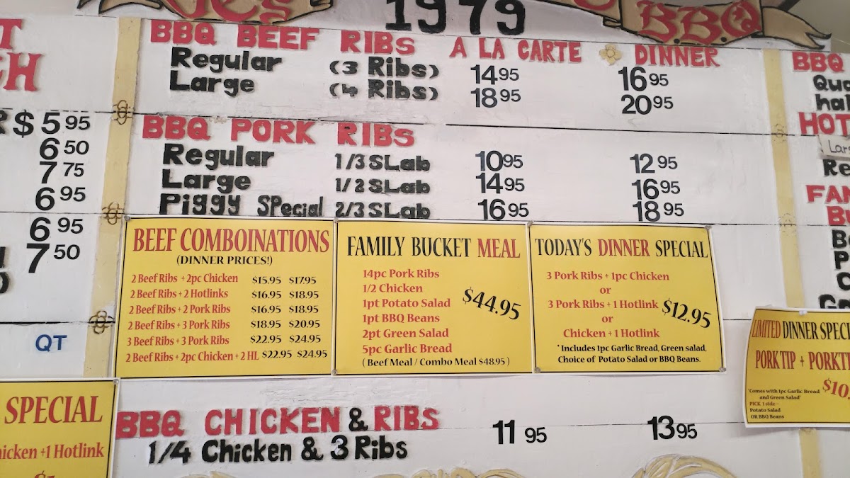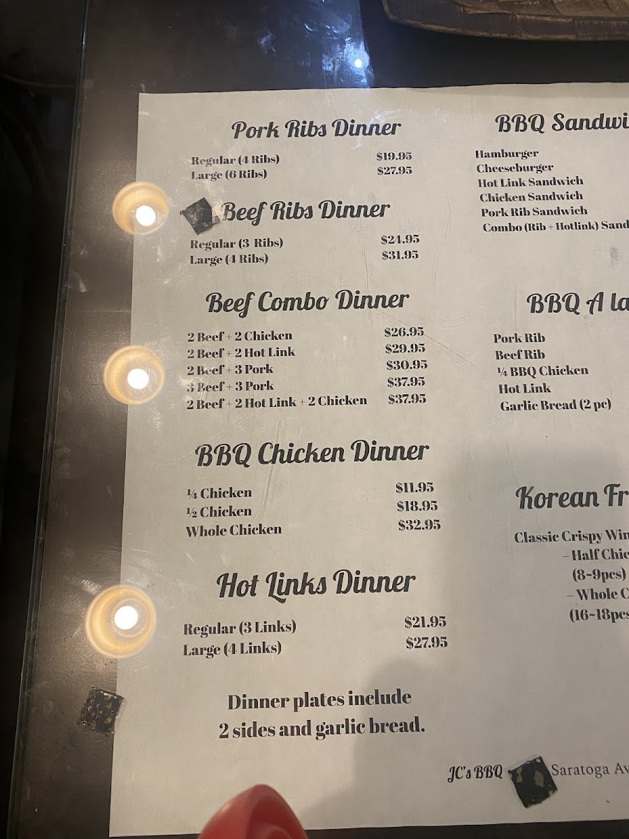 J C's Bar-B-Q, located at 1080 Saratoga Ave #8, San Jose, CA, offers a diverse and hearty menu that’s perfect for BBQ lovers. The restaurant’s specialty lies in its expertly grilled meats, with several options to satisfy any craving. For those who enjoy beef, the Beef Ribs Dinner comes in two sizes: Large (4 Ribs) and Regular (3 Ribs), providing a substantial portion of tender beef ribs. Another standout is the Hot Links Dinner, available in Large (4 Links) or Regular (3 Links), offering a spicy and flavorful twist to the BBQ experience.