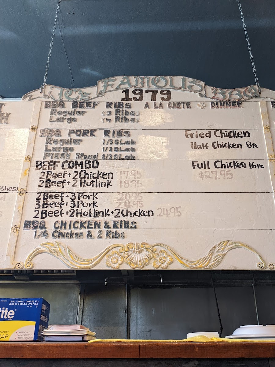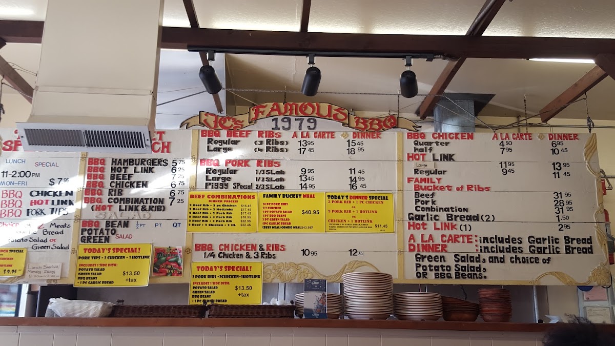 To round off your meal, the drink selection includes refreshing options such as Mexican Coca-Cola, Snapple Tea, and Jarrito. Whether you're stopping by for a quick bite or enjoying a full dinner, J C's Bar-B-Q offers a flavorful and satisfying dining experience that highlights the best of BBQ cuisine.