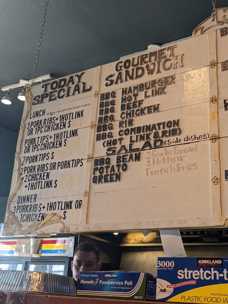 Choose from pork ribs, hot link, BBQ chicken and pork tips. Includes 1 side and garlic bread.